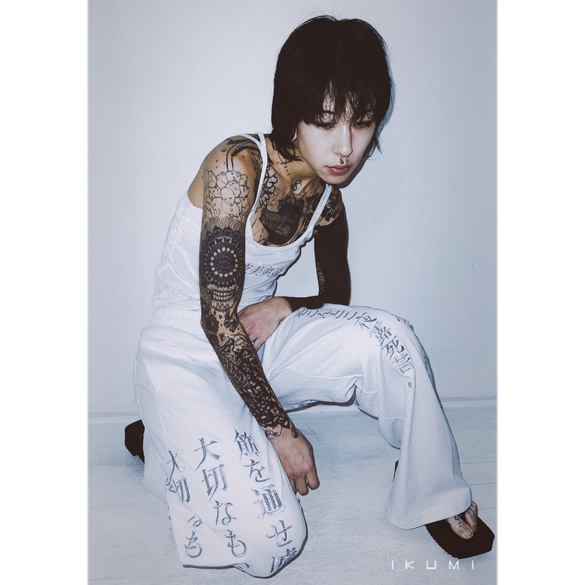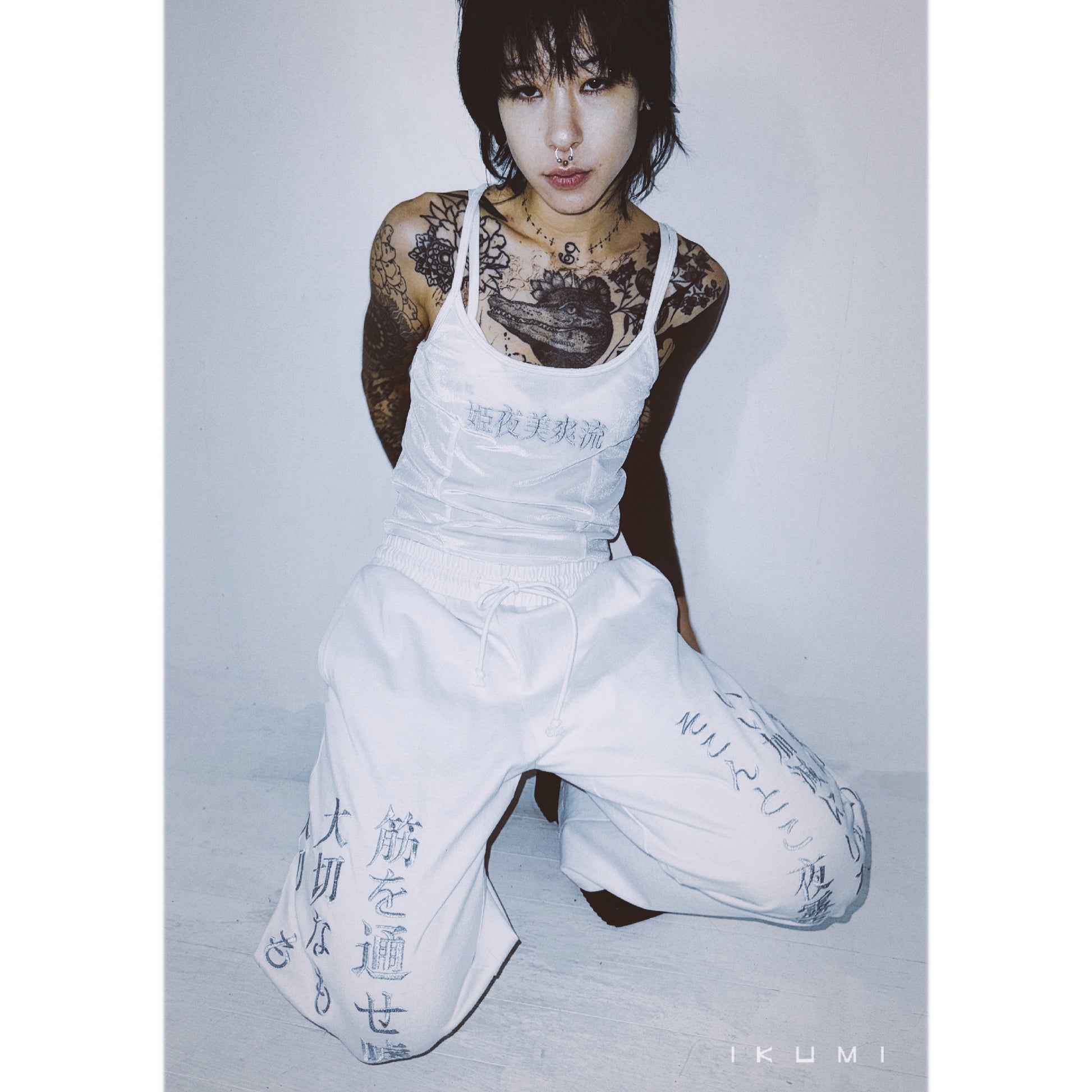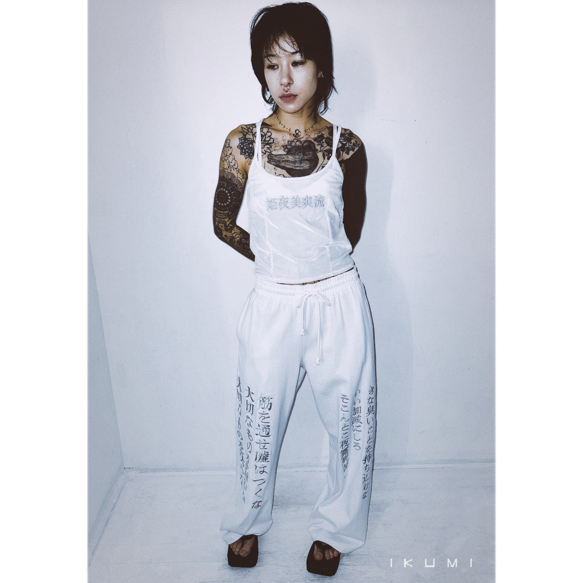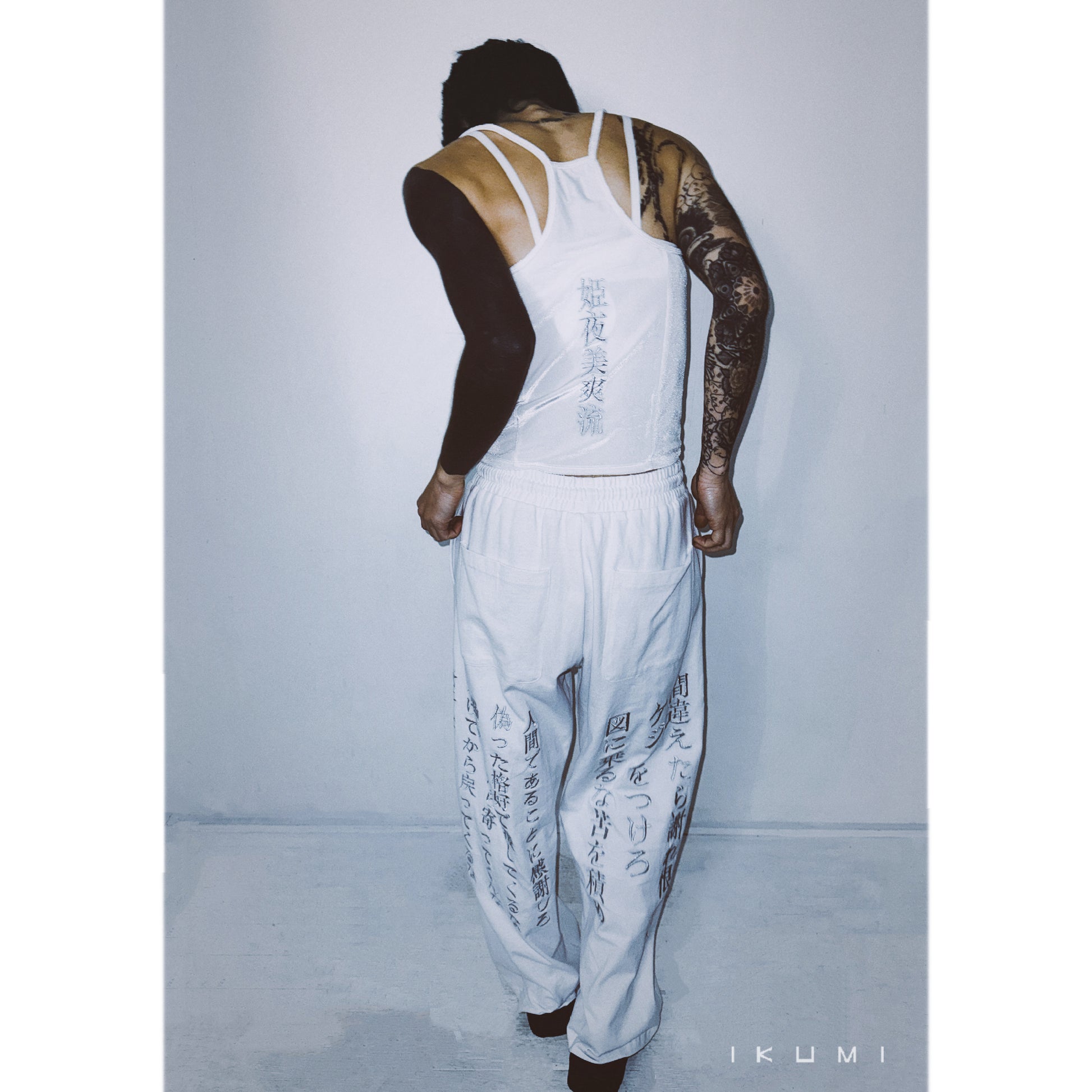 ・Linkes Knie, [Sei dankbar, dass du ein Mensch bist. Komm nicht zurück, nachdem ich mich entschieden habe Bring mir alles Unangenehme mit. Auf dem rechten Knie eingestickt: „Machen Sie keinen Sinn, lügen Sie nicht, stehlen Sie nicht, was wichtig ist, verlieren Sie nicht, was wichtig ist, entschuldigen Sie sich nicht, wenn Sie einen Fehler machen, Don.“ „Hege keinen Groll, bestrafe dich nicht, handle nicht nach Plan, sammle Bitterkeit“-Stickerei auf dem rechten Knie.