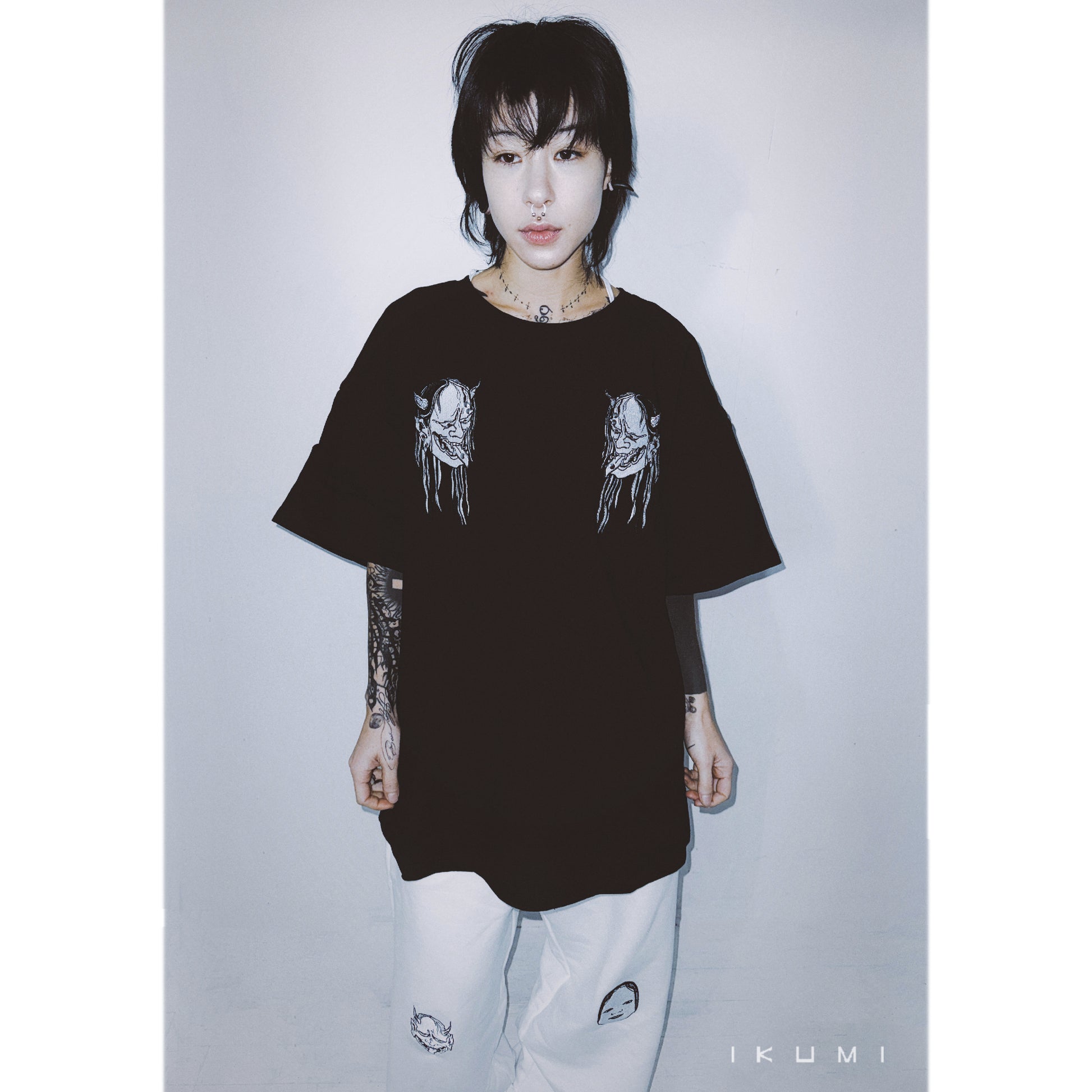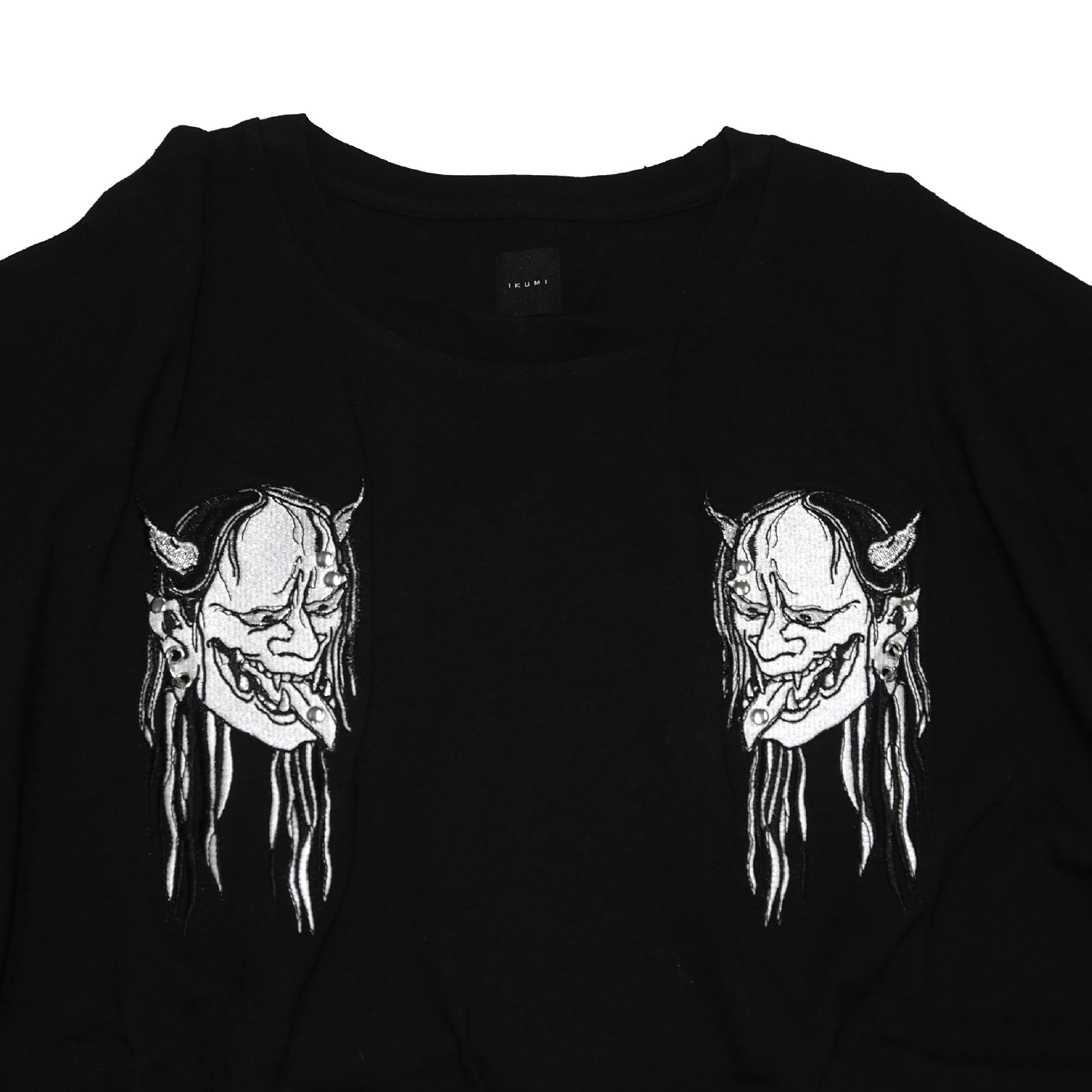 - Front facing “Hannya” (Hannya is a mask of a woman so engulfed in jealousy and obsession she becomes a demon) mask embroidery with facial piercings