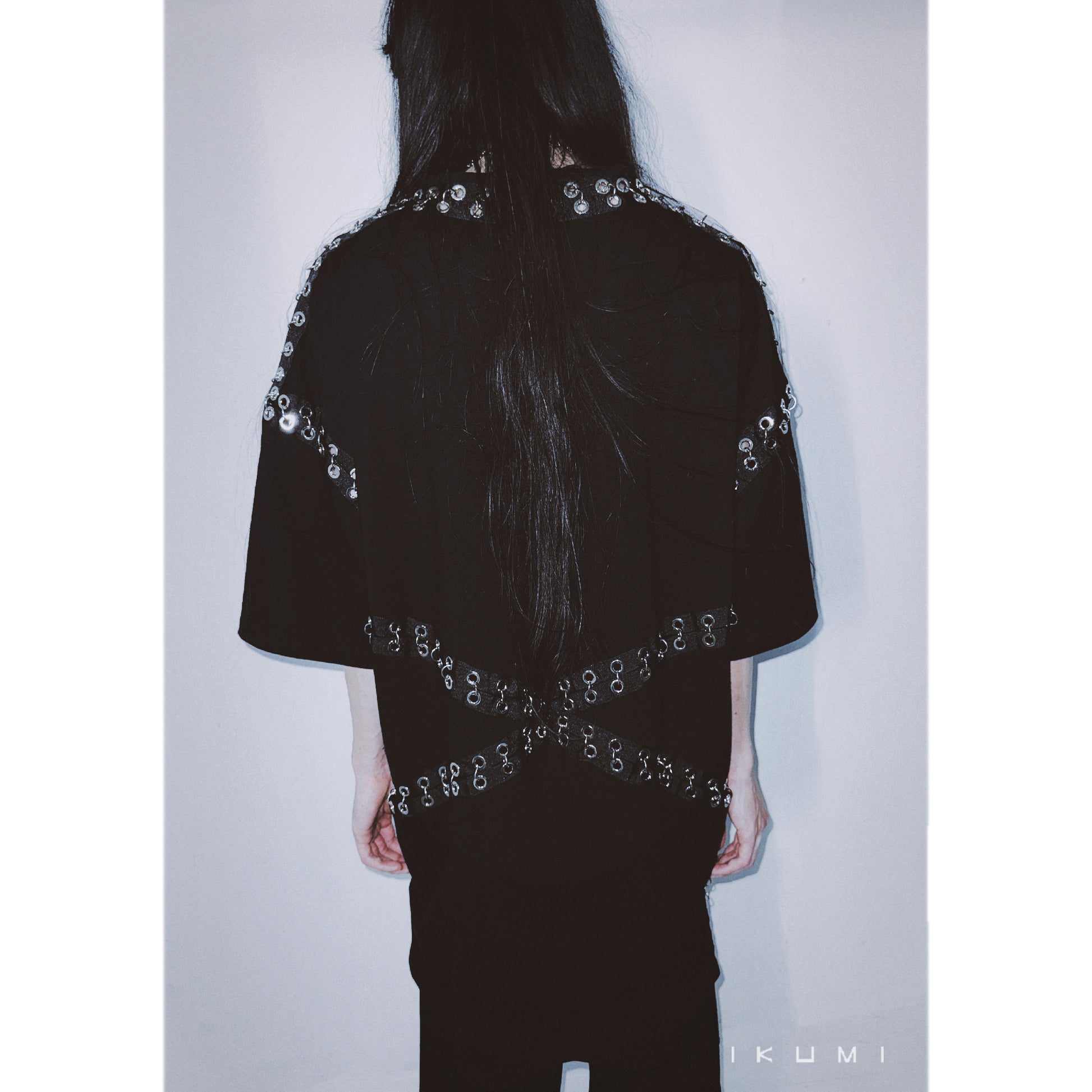 ・T-shirt joined together with metal hoops pierced through the material